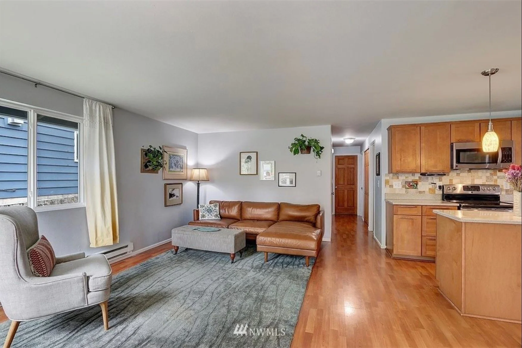 To keep costs reasonable and avoid adding to a landfill, the kitchen backsplash was painted instead of replaced. Changing the pendent lights also helped change the feel of the kitchen.